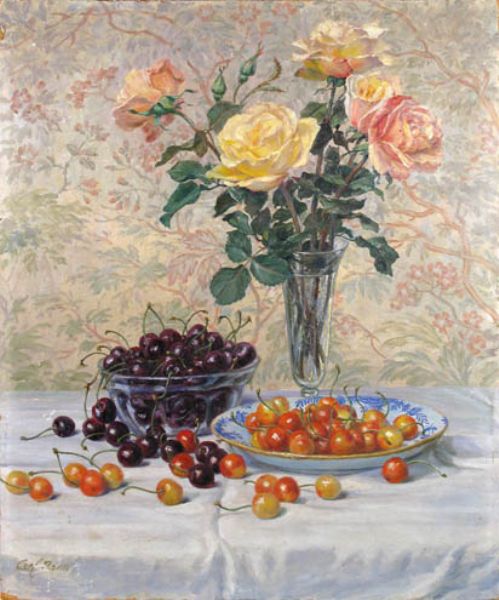 Strauß von erblühten Gartenrosen in einer Glasvase auf einem Tisch mit weißem Tuch