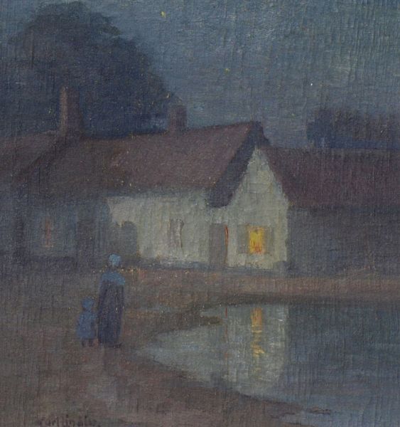 Nocturnal Scene with Mother and Child Near a Village Pond