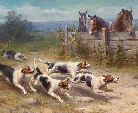 ack-Russell-Meute auf der Jagd, hinter Hag 3 Pferde