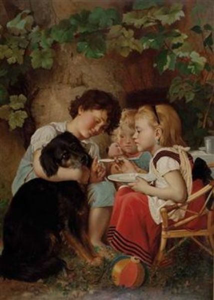 Drei Kinder beim Hundefüttern
