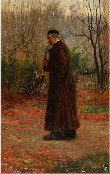 An elderly man smokes pipe on his walk