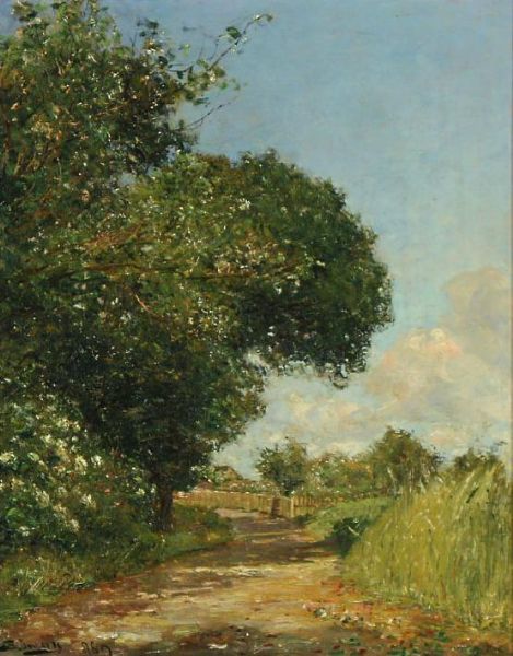 | Flowering shelf bushes and tall grass along a country lane | |
