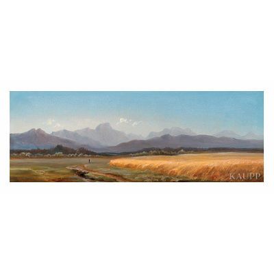 Blick über Getreidefelder auf den Wendelstein in Oberbayern