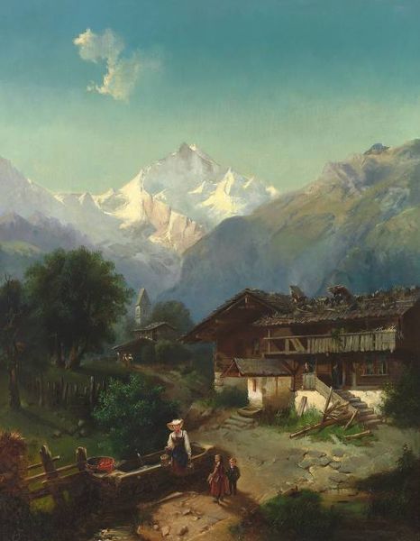 | Blick auf das Jungfraumassiv im Berner Oberland. Im Vordergrund malerisches altes Bauernhaus und Figurenstaffage am Brunnen. Pra | |
