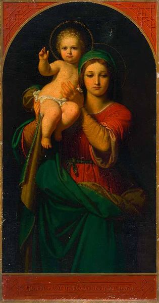 | Madonna mit Kind. Unten Inschrift: „Benedicentur in ipso omnes tribus terrae“ | |