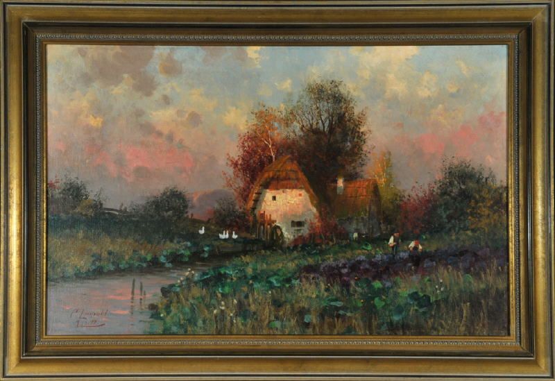 Bauern vor Gehöft mit Wassermühle am Bach bei morgendlicher Feldarbeit