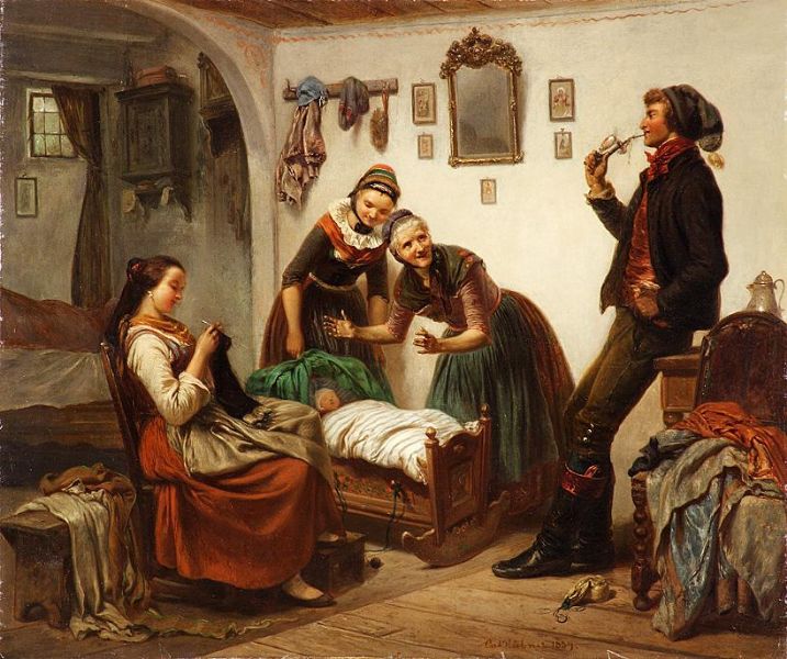 Der stolze Vater an der Wiege seines Estgeborene