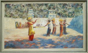 Balinese dancers in a sunlit courtyard