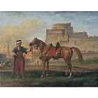 A MAMELUK LEADING HIS HORSE WITH A CITADEL IN THE BACKGROUND
