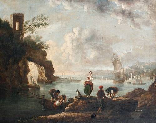 | An Italianate landscape, with fishermen working on a shore and a city in the distance | |