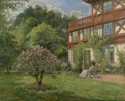 Sommerliche Gartenszene mit Dame und Hund in Ho...