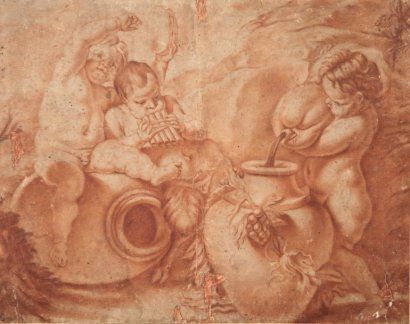Jeune satyre à la flûte, amour au tambourin et enfant à la jarre