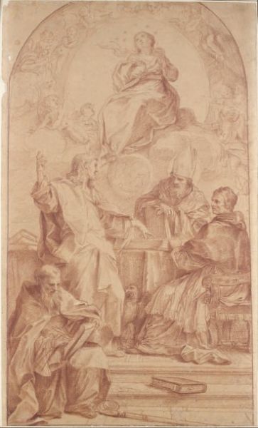 | L'immaculée Conception, Saint Jean l'Evangéliste discutant avec les Pères de l'Eglise, Saint Grégoire, Saint Jean Chrysostome et | |