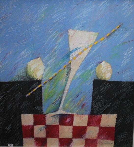 Still life of a glass on a red and white chequered table cloth flanked by two lemons
