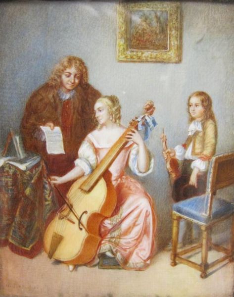 A Miniature on Ivory depicting an Interior Scene with Musicians playing cello