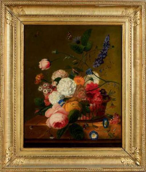 Bouquet de fleurs dans une corbeille posée sur un entablement