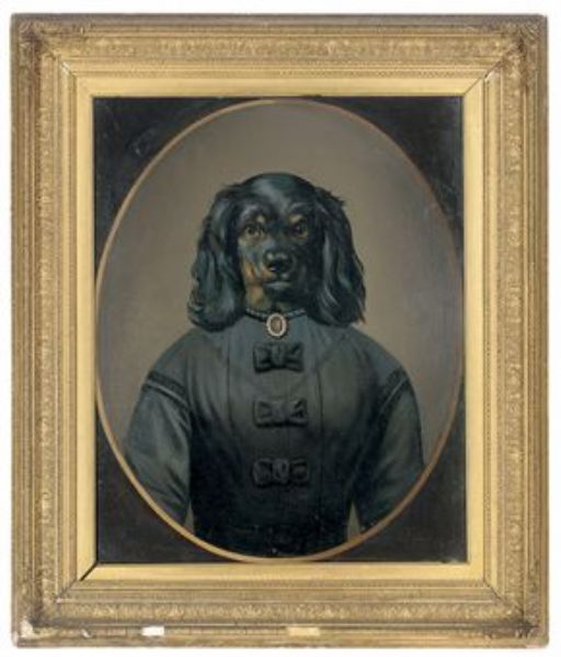 | An anthropomorphic King Charles spaniel, in a black dress | |