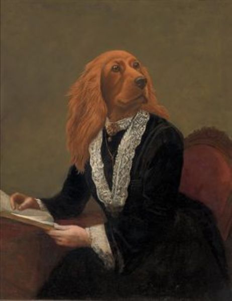 | An anthropomorphic red setter, seated in a black dress with lace collar and cuffs | |