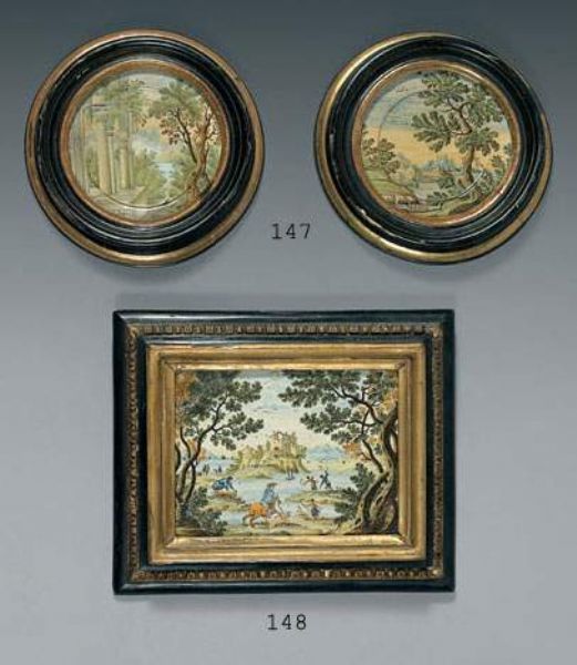 | Plaque rectangulaire en faïence, décorée en polychromie d'une scène animée de chasseurs et de pêcheurs près d'étangs entourant u | |