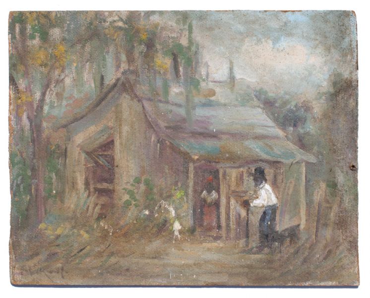 Black man and woman in Florida swamp scene with cabin