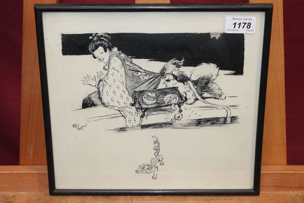 Japanese figure and a Pekingese toppling over a breakfast tray