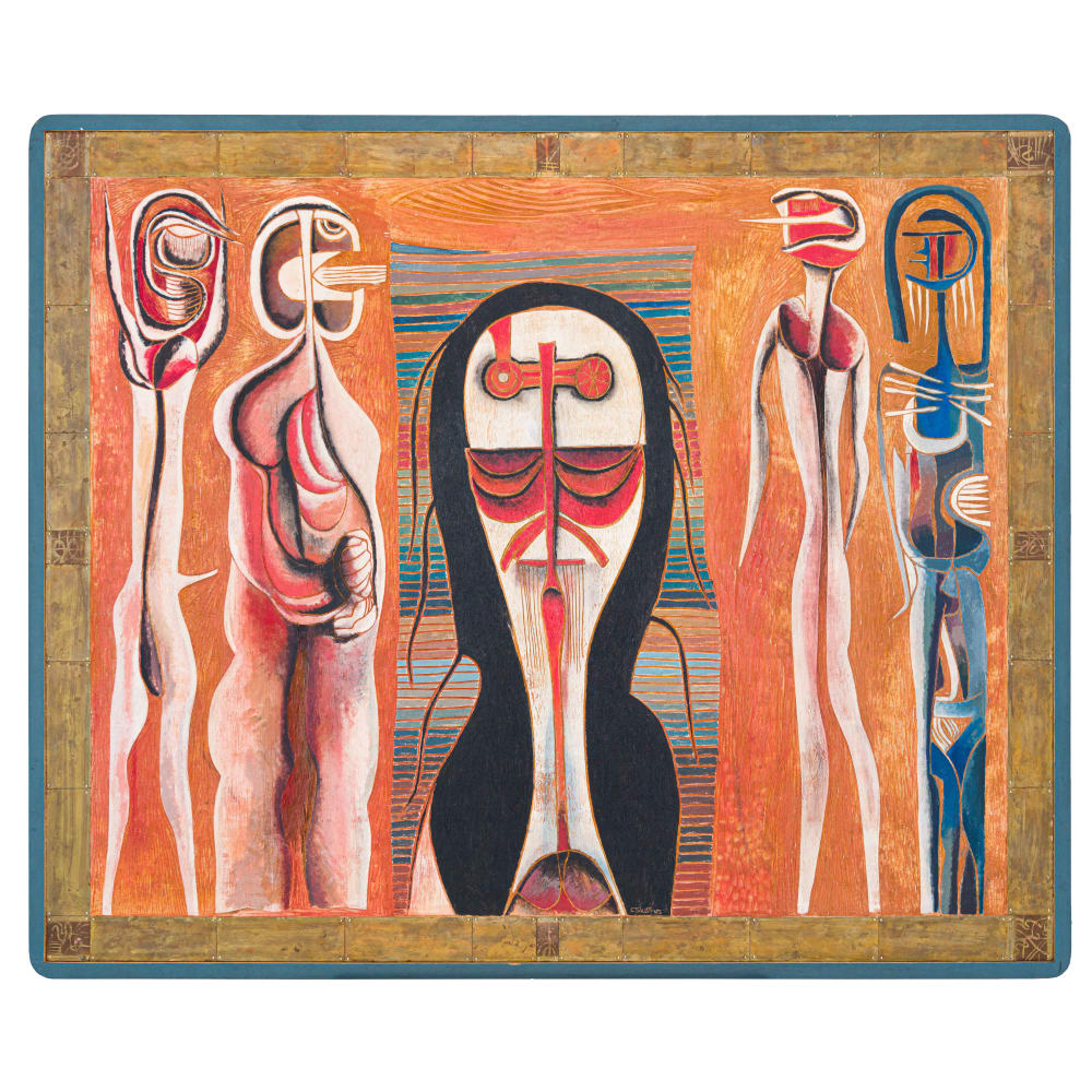 | Painted , carved and incised wood panel in the artist's hand-made frame | |