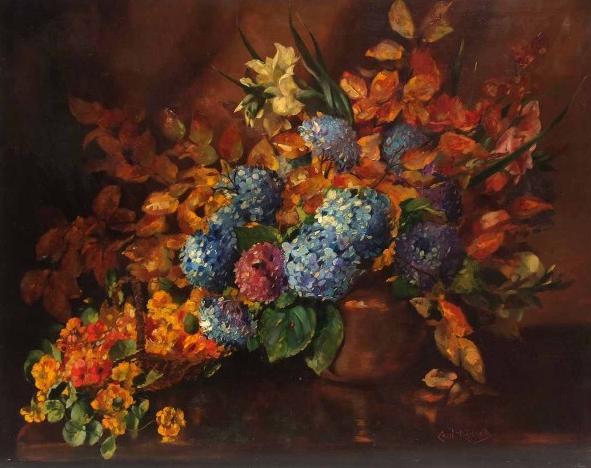 Still Life with Nasturtiums and Hydrangeas in a copper pot