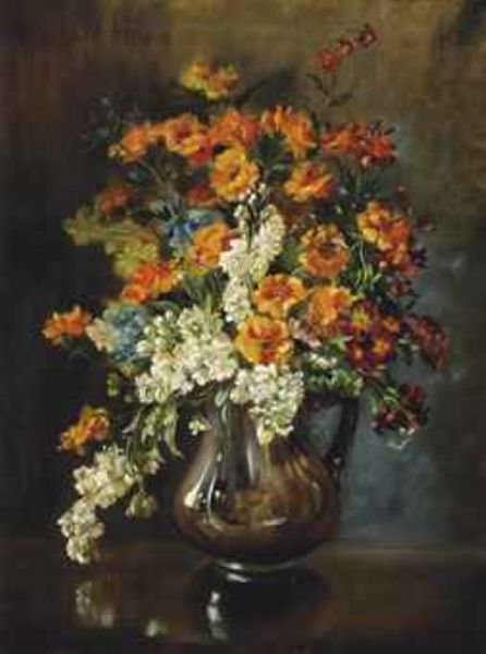 Wallflowers, stocks and forget-me-nots in a silver jug