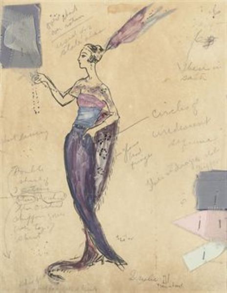 | Costume design for an elegant lady with swatches of fabric and artist's annotations | |