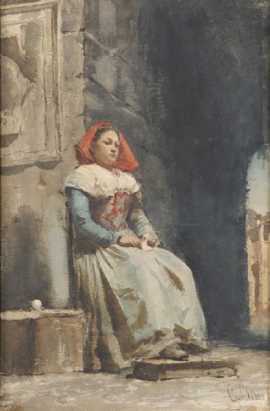 | depicting a young Italian woman with a red head covering knitting in a courtyard | |
