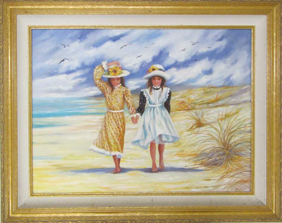 | Two young girls holding hands at the beach. | |