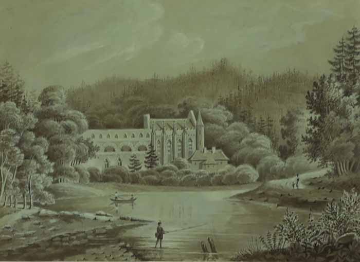 | DUNKELD CATHEDRAL WITH ANGLER FISHING THE TAY IN THE FOREGROUND | |