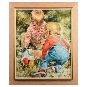 Två barn ritandes ute i grönska