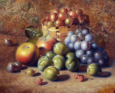 Apples, Plums, Damsons, Gooseberries Grapes and raspberries, on a mossy bank