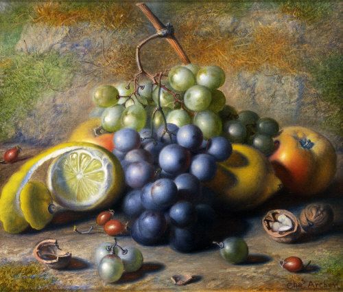 Still Life, Apples, Lemon, Grapes and Walnuts, on a mossy bank