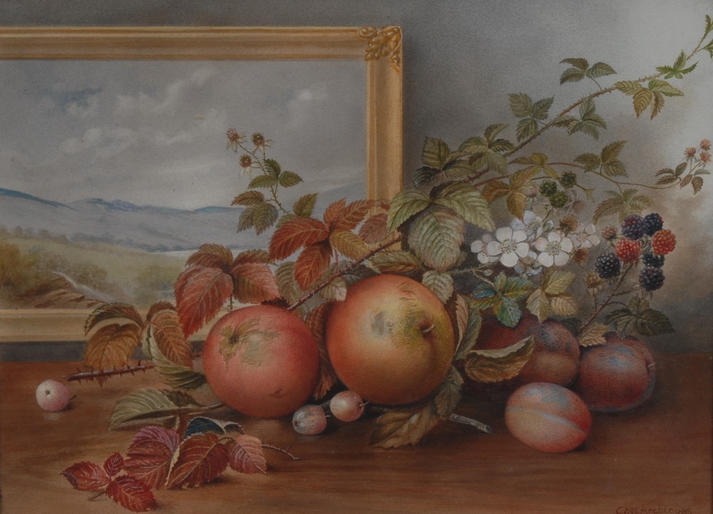 | Still life, Ripe Apples, Plums, Blackberries and Hellebores Before a Rolling Landscape | |