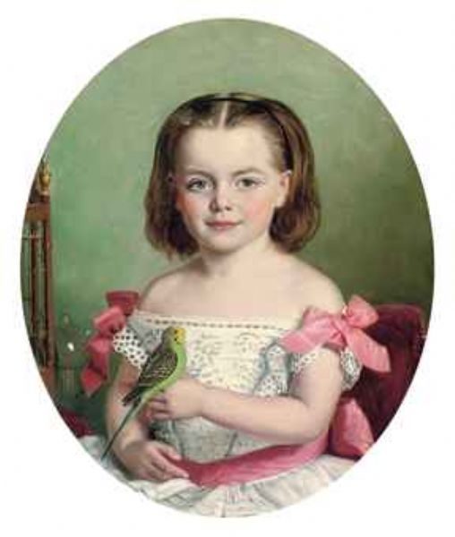 | Portrait of Mary Ann Maitland-Wilson of Greystone Towers, three quarter length, in a white dress with red ribbons, holding her b | |