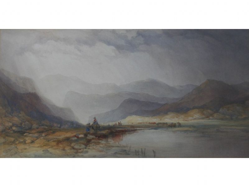 LAKE WITH MOUNTAINS, FIGURES AND CATTLE