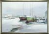 | Oil on canvas scene shows a green hulled two-mast sailboat at dock with another moored beside. Several other boats are seen in harbor. | |