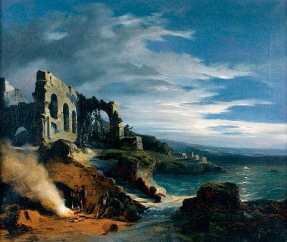 | Contrebandiers près d'une plage surmontée d'une ruine d'église | |