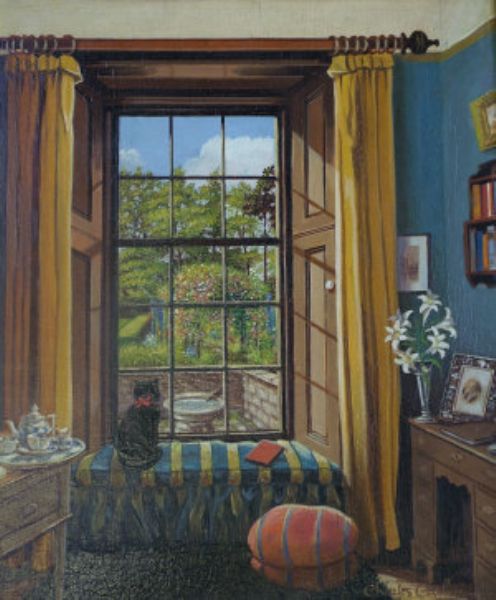 Cat looking out a window at a garden