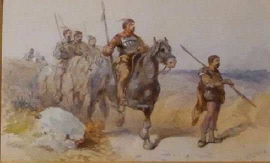 Warriors on horseback in bleak rugged landscape, possibly Genghis Khan