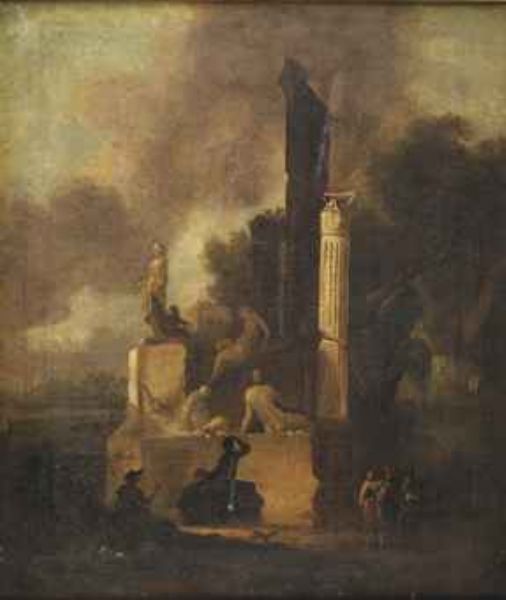 | An Italianate landscape with a marble sculpture, a Roman column and classical ruins, an artist drawing and figures conversing in | |