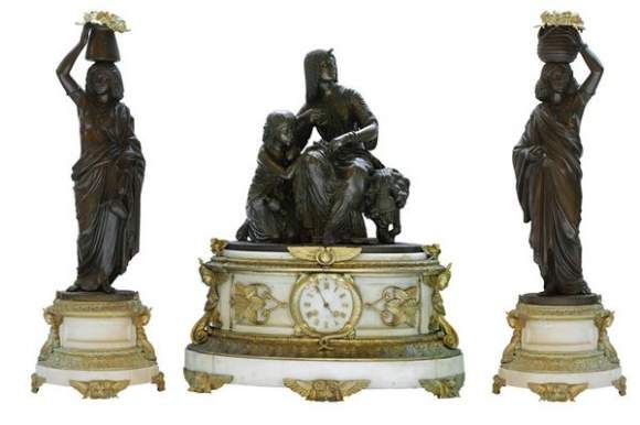 | Garniture de cheminée en bronze ciselé, doré et patiné comprenant une pendule et deux bases de candélabres. Le cadran et le grou | |