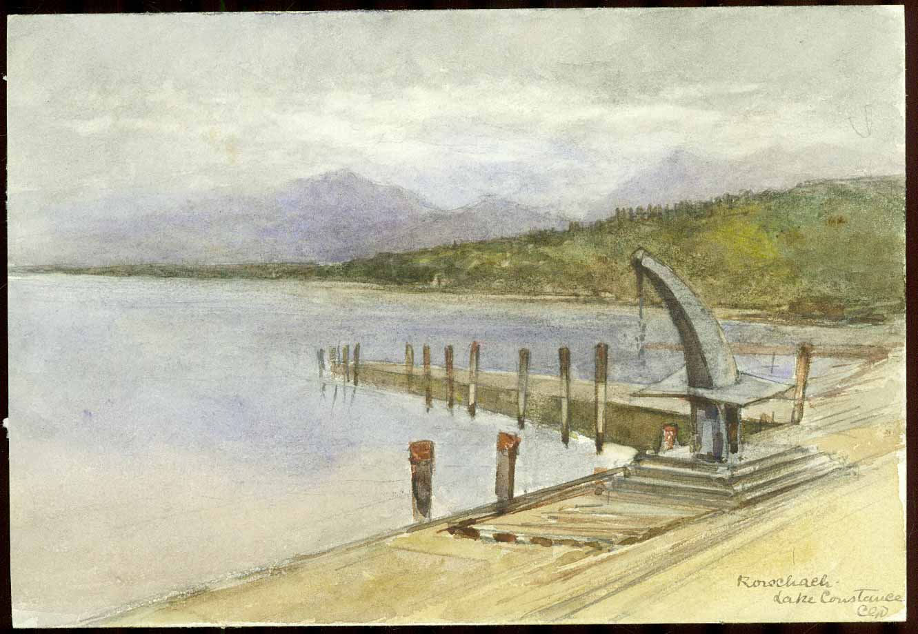 Bodenseeufer mit Anlegesteg und Schiffskran.