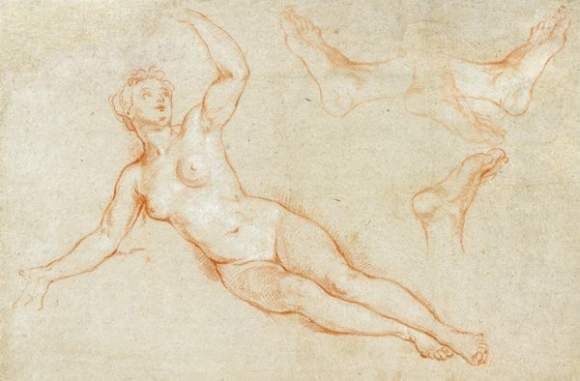 | Étude d'une femme nue étendue, le bras gauche levé, et reprises de pieds à droite | |