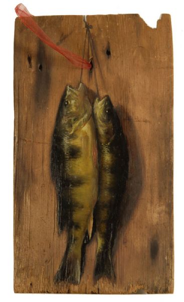 Two yellow perch hanging from a nail