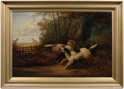 two spaniels spotting a pheasant