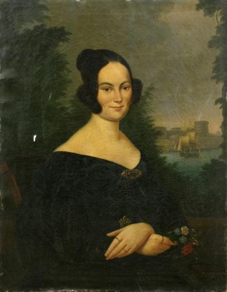Portrait de dame tenant un bouquet sur fond de paysage maritime