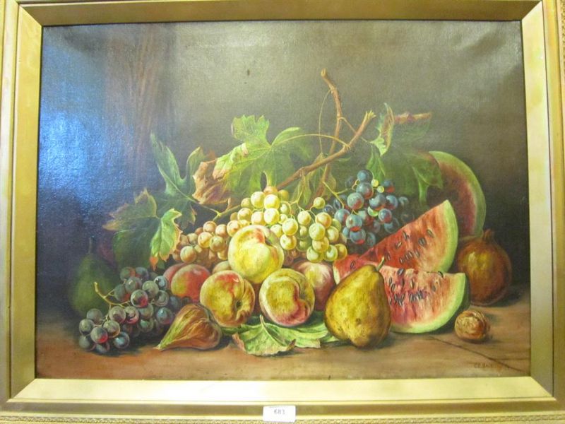 A Still Life of Grapes, Melons and other Fruit on a Ledge